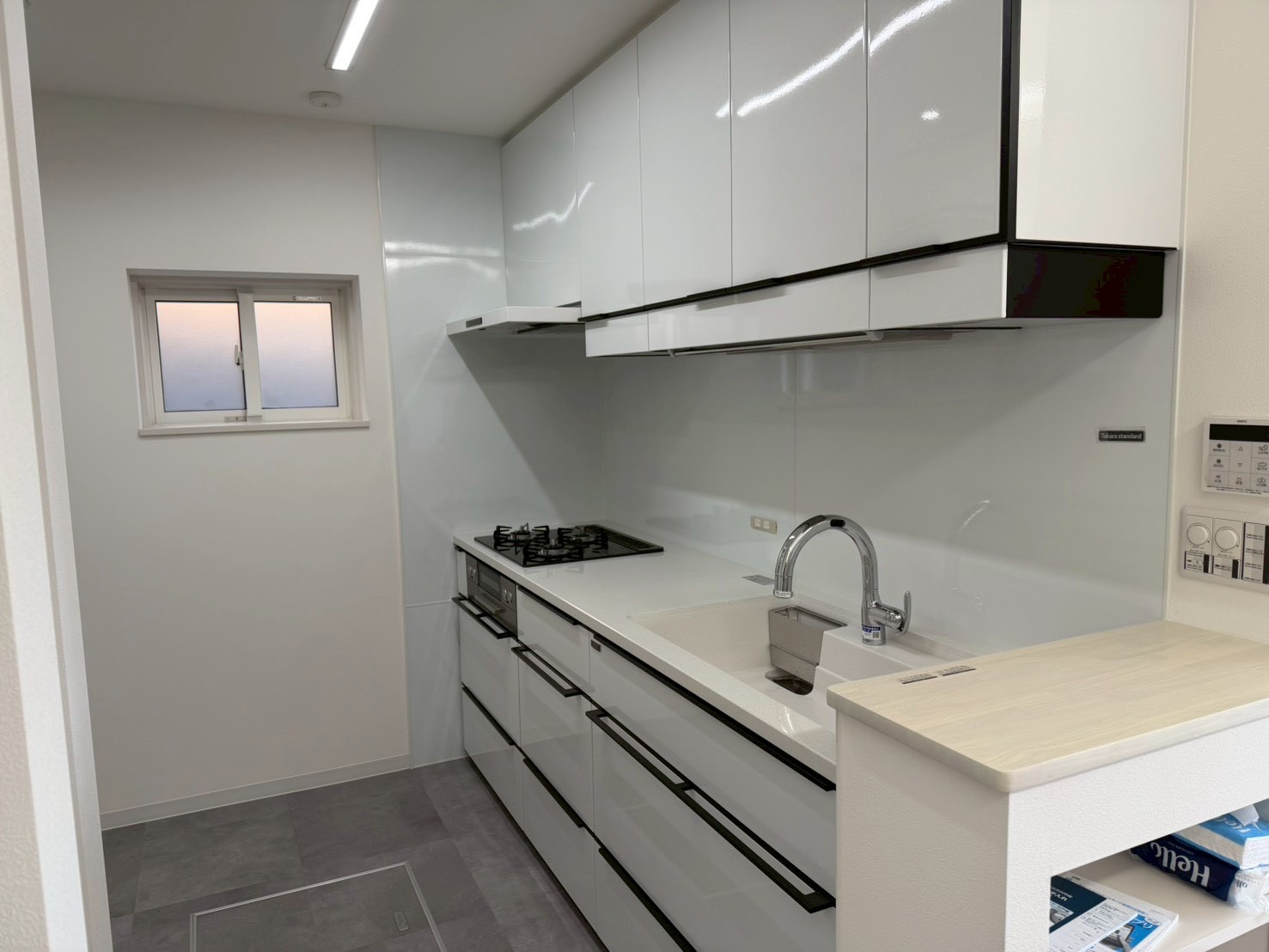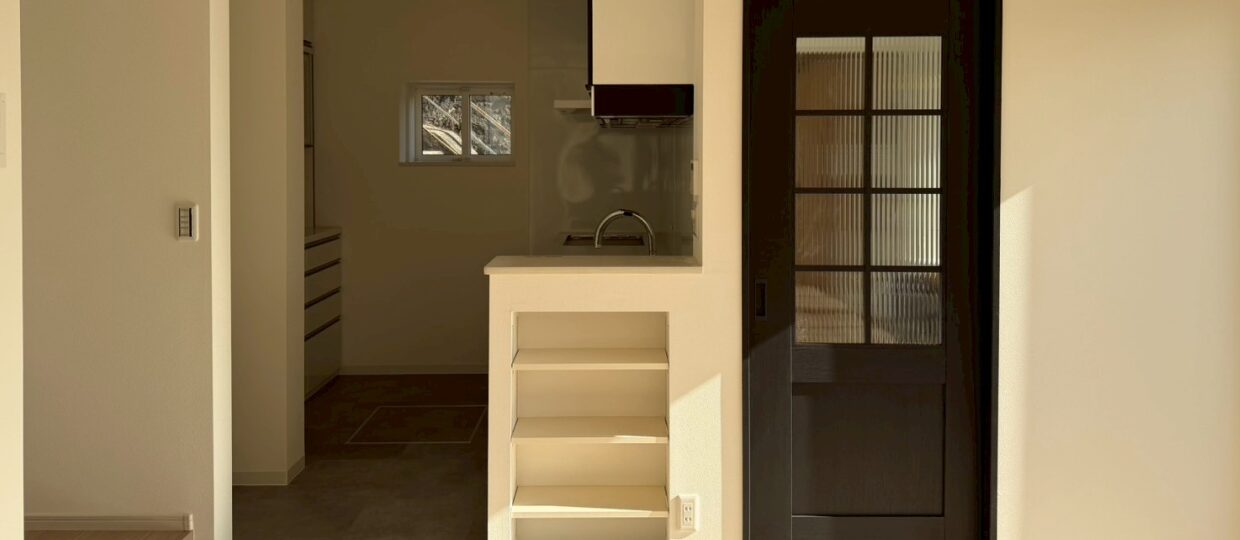 室内はキッチンの向きを変更し、キッチンのサイズアップと収納量の向上を実現。
