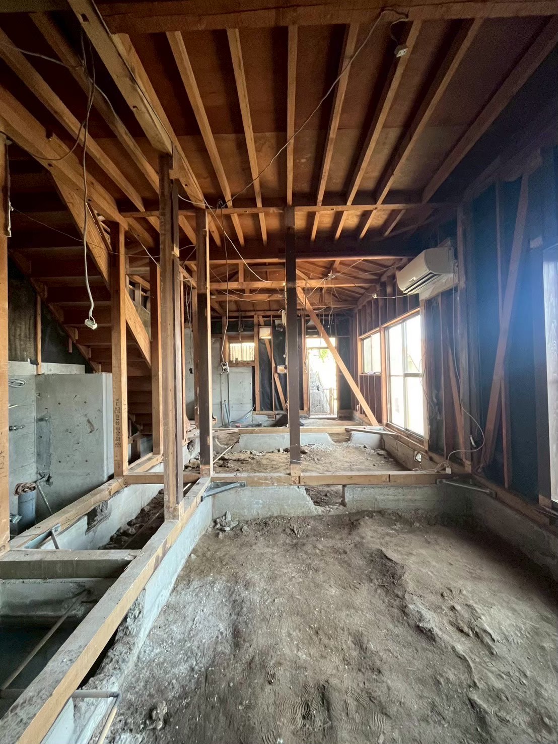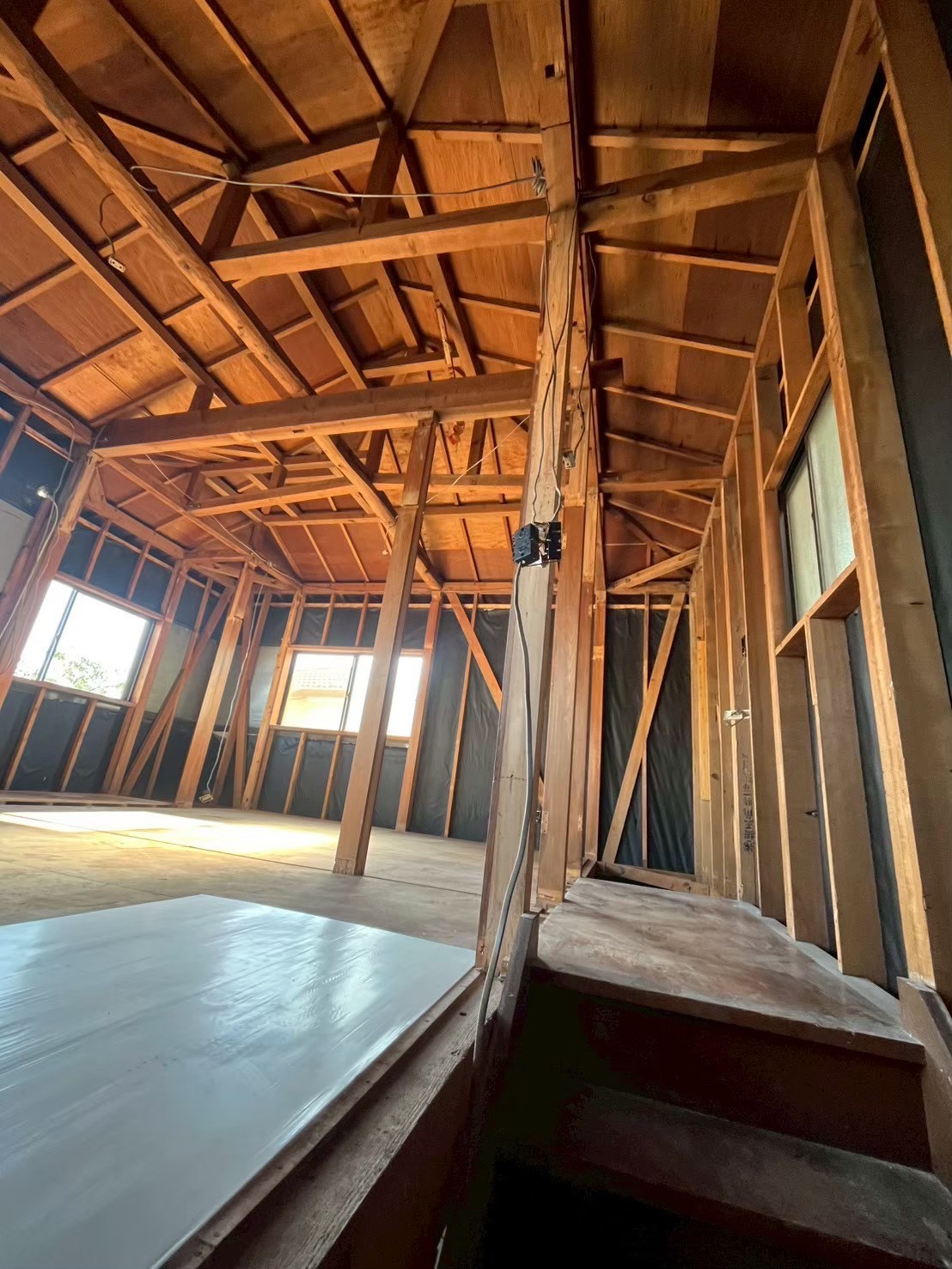 2階は解体後、きれいな梁や小屋束が現れたため、あえて天井を設けず、構造材を表したデザインへと計画を変更しました。
